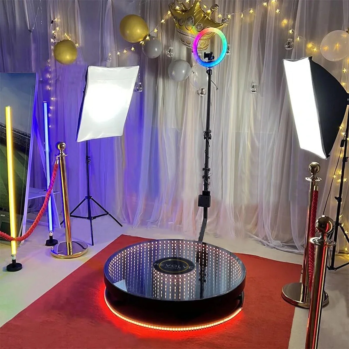 Dazzling 360 booth with an infinity mirror base that glows with vibrant RGB LED lights, creating a captivating effect under every step.